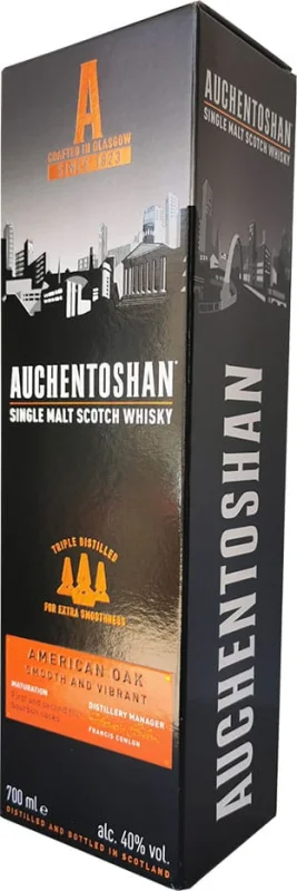 | Marca | AUCHENTOSHAN | | Capacidad | 70 CL | | Formato | Glass | | Zona de Producción | Lowland | | Destilaciones | 3 | | Tipo | Single Malt | | Barricas | American ex-Bourbon casks | | Graduación Alcohólica | 40% | Notas de Cata | To The Eye: Look for the vivid, bright gold colour when selecting your Auchentoshan American Oak. Wondering what gives whisky its colour? The delicate maturing process. As the single malt matures in the quality bourbon barrels, a new and complex colour and flavour profile is created over time.