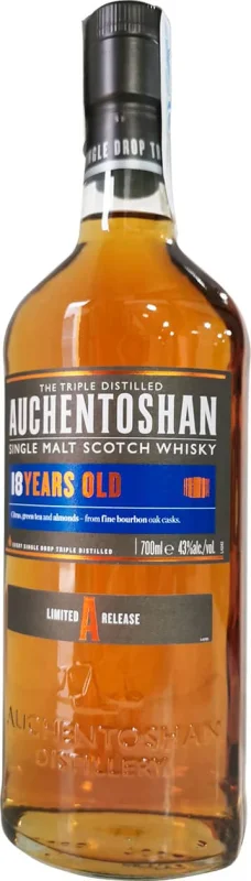 | Marca | AUCHENTOSHAN | | Volume | 70 CL | | Formato | Vetro | | Zona di Produzione | Lowland | | Destillazione | 3 | | Tipo | Single Malt | | Botte | Americana ex-Bourbon | | Gradazione Alcolica | 43% | | Riserva | 18 Anni |