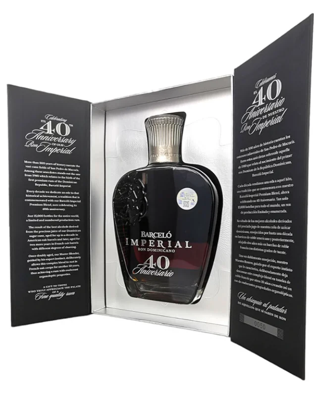 Barceló Imperial Premium Blend 40th Anniversary is presented in a delicate case that encapsulates the history of its creation, and for this, a bottle with stylized shoulders is selected, crowned with an elegant stopper engraved with the 40th Anniversary of the brand, capturing all its heritage.
