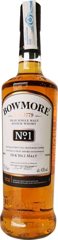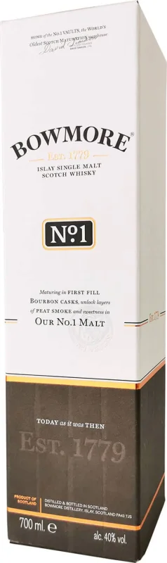 | Brand | BOWMORE No. 1 | | Size | 70 CL | | Format | Glass | | Region Produced in | Islay | | Type | Single Malt | | Cask | American ex-Bourbon casks | | Alcohol Content | 40% | Tasting Notes | On The Eye: Warm gold Breathe In: Vanilla fudge, sea air and peat smoke, balanced beautifully by honeycomb and cinnamon spice Sip: Citrus, gentle saltiness and vanilla with flakes of coconut Savour: Peat smoke, bourbon vanilla and lime |