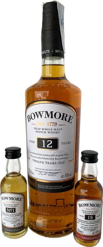 Descripción ampliada Whisky Bowmore Reserva 12 años + Bowmore 15 Darkest 5 cl + No1 5 CL (Islay)