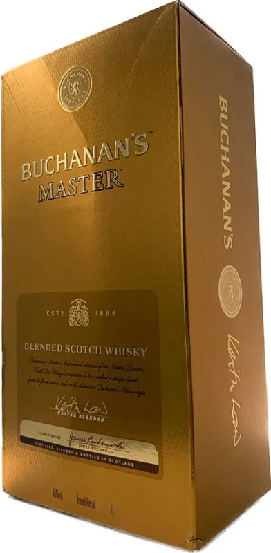 | Brand | BUCHANANS MASTER | | Size | 1 Litre | | Format | Glass | | Type | Blended | | Cask | American white oak casks | | Alcohol Content | 40% | | Reserve | 15 Years | Tasting Notes | Color: Rich Amber Aroma: Fresh & spicy, with herbal and creamy chocolate tones Taste: Sweet & creamy, with notes of oranges and vanilla Finish: A tingle on the tongue, followed by a dry finish and taste of nuts | | Awards | San Francisco World Spirits Competition 2014 - Double Gold |