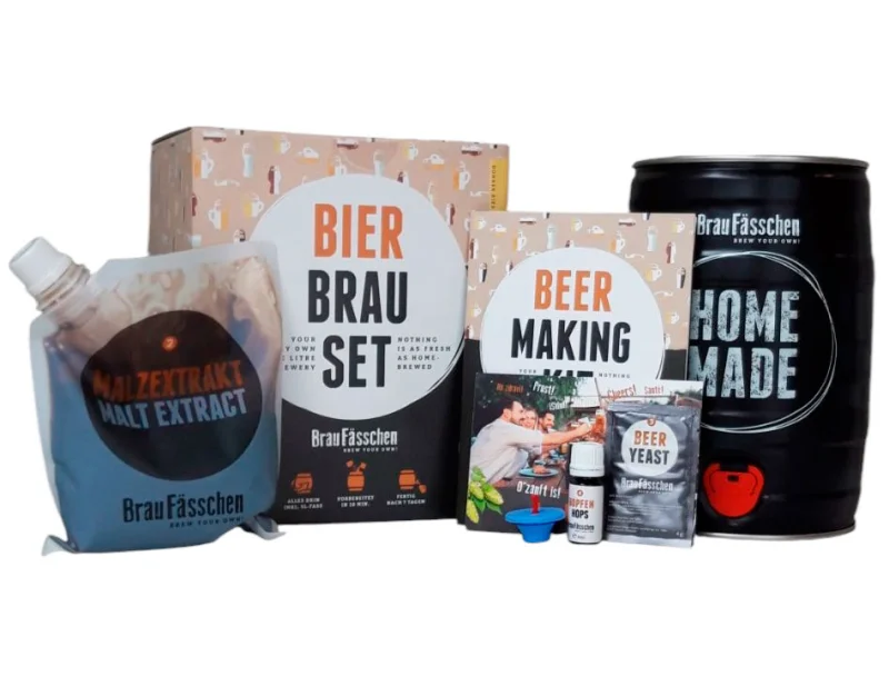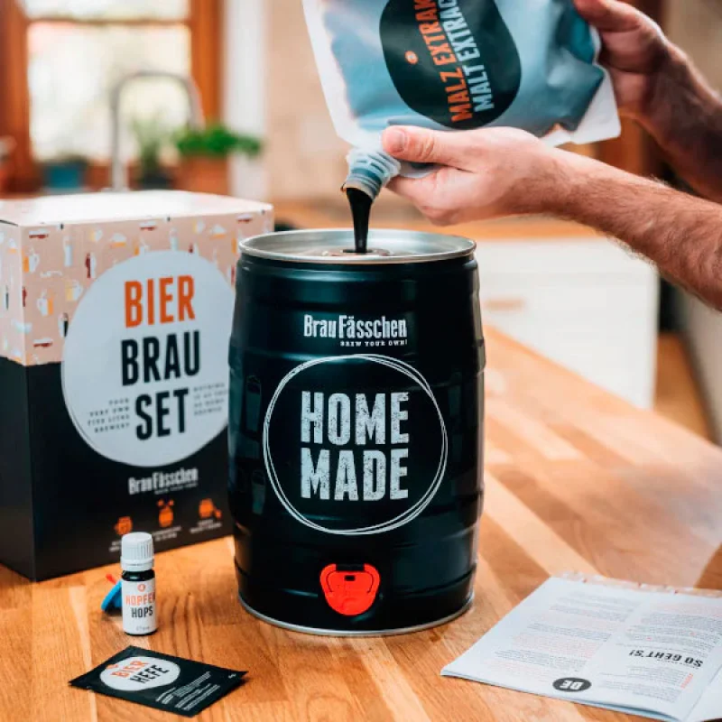 The Braufässchen craft black beer brewing kit includes a 5-litre empty keg and all the ingredients in the correct quantities to brew your own beer. This comprises malt extract, yeast and hops.