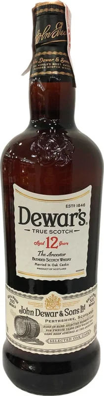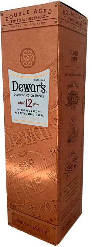 | Marke | DEWARS | | Inhalt | 1 Liter | | Format | Glas | | Typ | Blended | | Fass | Amerikanische Weißeiche | | Alkoholgehalt | 40% | | Alterung | 12 Jahre | | Prämierungen | Concours Mondial 2006 - Gold Medal Wine and Spirits Competition - Best in Class |