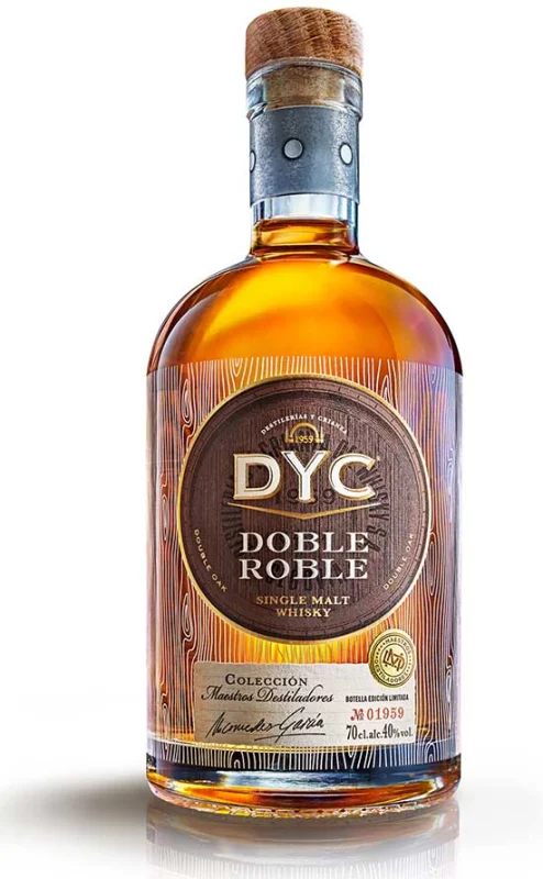 | Marca | DYC Doble Roble | | Capacidad | 70 CL | | Formato | Glass | | Zona de Producción | Segovia | | Tipo | Single Malt | | Graduación Alcohólica | 40% | Notas de Cata | Colour: intense golden amber. Nose: toasted oak, vanilla with intense aroma and caramel; notes of dried fruits. Taste: caramel, vanilla, roasted coffee and light spicy notes; smooth and rounded in the mouth. Finish: complex, elongated and a dry touch |
