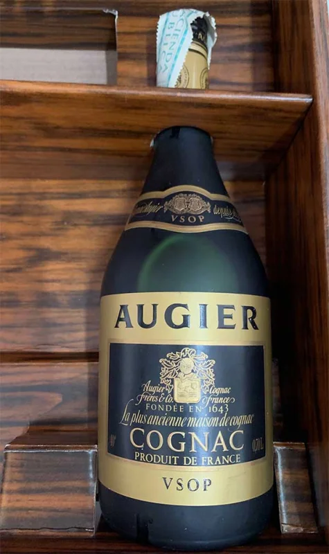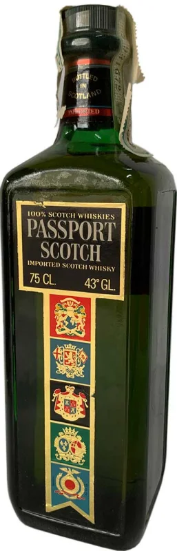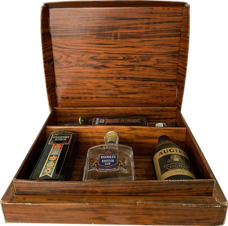 * Decorated box * 1 Bottle of Passport Scotch Whisky 75 CL 43%Vol from early 1970 * 1 Bottle of Geneva Boodles 75 CL 47%Vol by WM. CHAD ANDERSON & CO Ltd * 1 Bottle of AUGIER VSOP French Cognac * 1 pitcher of Passport Scotch