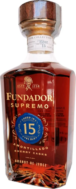 | Brand | FUNDADOR SUPREMO | | Size | 70 CL | | Format | Glass | | Region Produced in | Jerez de la Frontera | | Type | Great Reserve | | Cask | Spanish ex-Amontillado casks | | Alcohol Content | 40% | | Reserve | 15 years |