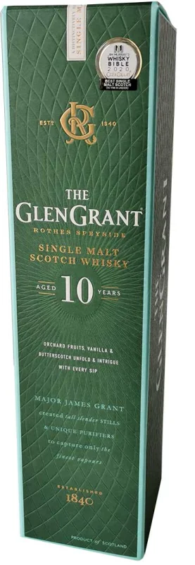 | Marca | GLEN GRANT | | Capacidad | 1 Litro | | Formato | Cristal | | Zona de Producción | Rothes, Morayshire, Speyside | | Tipo | Single Malt | | Barricas | Roble Blanco Americano ex Bourbon | | Graduación Alcohólica | 40% | | Reserva | 10 Años | Notas de Cata | Color: Rica cebada dorada Nariz: Medio/seco, con una buena combinación de maduras frutas de vergel Boca: Cremoso, afrutado Final: Intenso, afrutado |