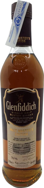 | Marca | GLENFIDDICH MALT MASTER'S EDITION | | Capacidad | 70 CL | | Formato | Cristal | | Zona de Producción | Dufftown | | Tipo | Single Malt | | Barricas | Roble Blanco ex Jerez, Roble Blanco Americano Nuevo | | Graduación Alcohólica | 43% |