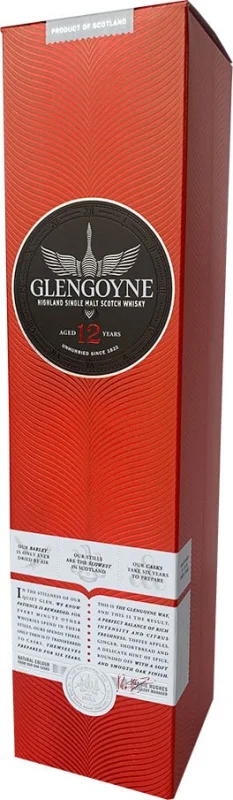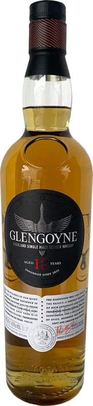 | Marca | GLENGOYNE | | Capacidad | 70 CL | | Formato | Cristal | | Zona de Producción | Higland | | Tipo | Single Malt | | Barricas | Roble Blanco Americano ex Bourbon, Roble Blanco ex Jerez | | Graduación Alcohólica | 40% | | Reserva | 12 años |