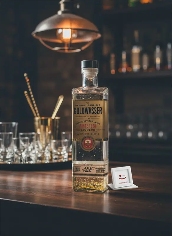 Goldwasser es un licor con virutas de oro y hasta veinte hierbas y especias distintas, tales como el cardamomo, coriandro y limón, con añadidura también de pomelo, junípero, lavanda, canela, apio y nuez moscada.