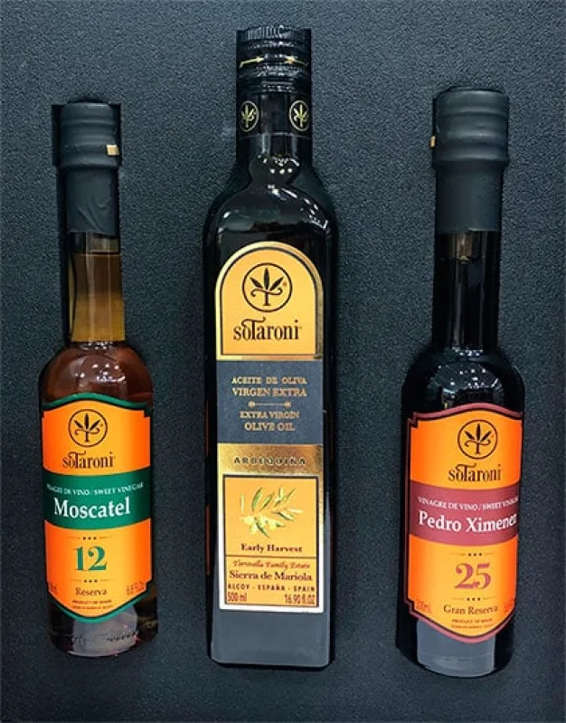 The Gourmet Sotaroni box is ideal for any person or company gift. Case with an extraordinary presentation containing our better selection of gourmet products. Extra Virgin Olive Oil Arbequina considered one of the best in the world and two Spanish sweet wine vinegars Plowing delight any palate.