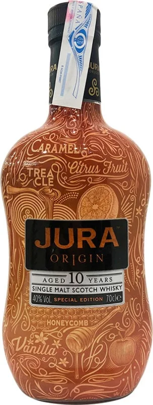 | Brand | JURA ORIGIN | | Size | 70 CL | | Format | Glass | | Cask | American ex-Bourbon casks, Spanish ex-Oloroso casks | | Alcohol Content | 40% | | Reserve | 10 years | Tasting Notes | COLOUR: Warming golden glow NOSE: Soft nuances of American white oak with a smooth, sweet aroma of honey TASTE: A refined, smooth and clean tasting liquid with gentle oak flavours, followed by highlights of caramel and soft liquorice. The warmth of roasted coffee beans lingers long in the mouth | | Package | Bottle |