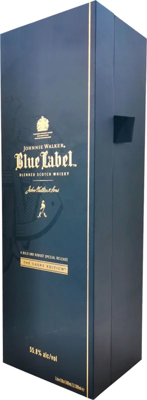 | Marca | JOHNNIE WALKER BLUE LABEL CASK EDITION | | Capacidad | 1 Litro | | Formato | Cristal | | Zona de Producción | Kilmarnoch | | Tipo | Blended | | Graduación Alcohólica | 55,8% | | Reserva | 50-60 Años |