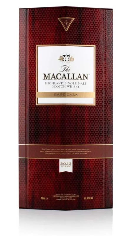 | Marca | THE MACALLAN RARE CASK | | Capacidad | 70 CL | | Formato | Glass | | Zona de Producción | Highland | | Tipo | Single Malt | | Barricas | Spanish ex-Jerez casks, American white oak casks | | Graduación Alcohólica | 43% | | Añada | 2022 |