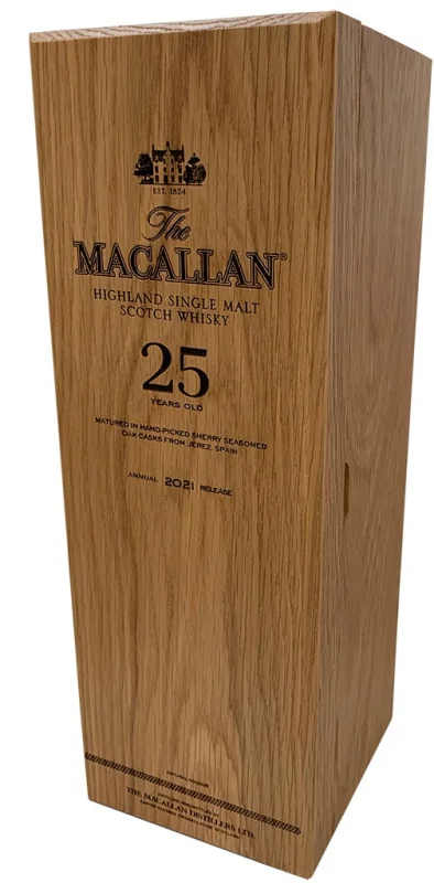 The Macallan Sherry Oak 25 Años se madura durante 25 años y solo en barricas de roble que previamente han albergado jerez oloroso de Jerez (España).