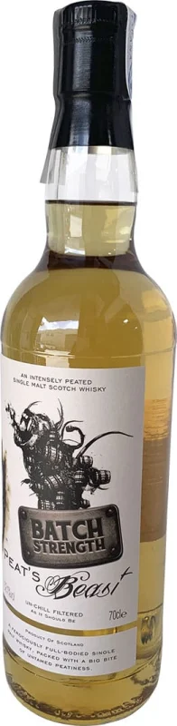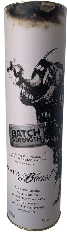 Peat's Beast Batch Strenght es un whisky de malta fuertemente turbado, con un nivel de fenol de 35 ppm (partes por millón). Procede de una destilería misteriosa de Speyside en Escocia. Madurado en barricas de bourbon, embotellado por un embotellador independiente, Fox Fitzgerald.