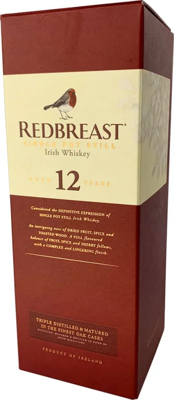 Redbreast Reserva 12 Años es un whisky irlandés estilo Pot Still, elaborado de una mezcla de cebada malteada y no malteada, con triple destilación en alambiques de cobre, Redbreast cuenta con la complejidad del sabor y cualidades distintivas del whisky Pot Still.