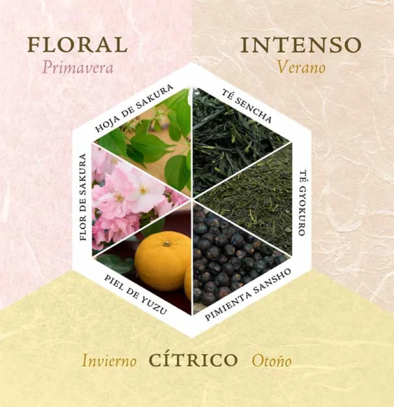 Flor de Sakura, hoja de Sakura, cáscara de Yuzu, té Sencha (té verde), té Gyokuro (té verde refinado) y pimienta Sanshō.