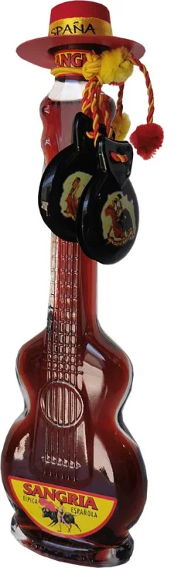 Sangria typiquement espagnole présentée dans une bouteille amusante rappelant une guitare espagnole.
