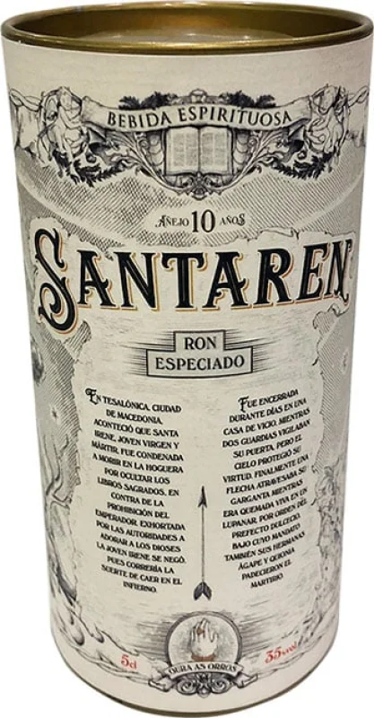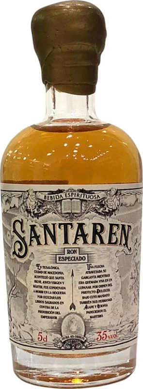 | Marca | SANTAREN | | Capacidad | 5 CL | | Formato | Cristal | | Zona de Producción | Rep. Dominicana, Guyana Inglesa y España | | Barricas | Roble Blanco Americano ex Bourbon, Roble Blanco Americano Nuevo | | Graduación Alcohólica | 35% | | Reserva | 10 Años |