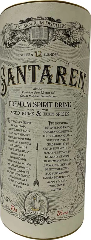Santaren en un ron añejo especiado hecho en España, resultado perfecto de mezcla, infusion y maceración de especias secretas. Santaren es la mezcla de 4 rones, 2 de caña virgen sin envejecer de origen Español (Motril), ron de caña Demerara del la Guyana y ron de caña Dominicano envejecido 12 años, macerado lentamente y en la mas estricta oscuridad.