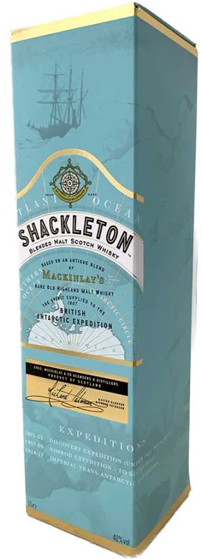 Der Shackleton Blended Malt Scotch basiert auf dem Geist, der für die britische Antarktisexpedition von 1907 geliefert wurde, meisterhaft hergestellt aus einer Auswahl der feinsten Highland Single Malt Scotch Whiskys.