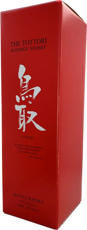 | Marca | THE TOTTORI | | Capacidad | 70 CL | | Formato | Cristal | | Zona de Producción | Kurayoshi, Tottori | | Tipo | Blended | | Barricas | Roble Blanco Americano Nuevo | | Graduación Alcohólica | 43% |