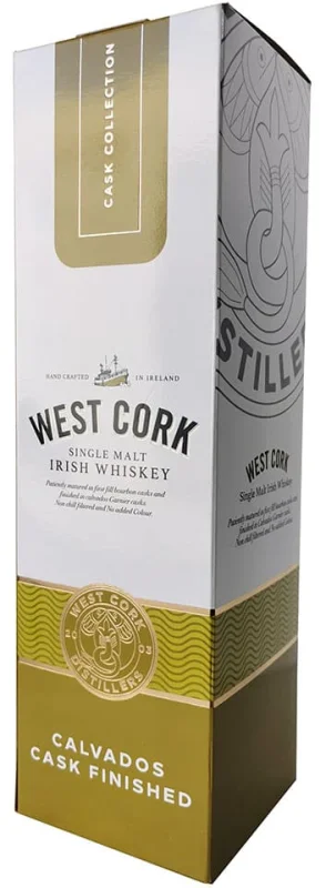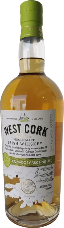 | Brand | WEST CORK | | Size | 70 CL | | Format | Glass | | Region Produced in | Skibbereen - Cork | | Destillations | 3 | | Type | Single Malt | | Cask | Ex-Calvados Casks, American ex-Bourbon casks | | Alcohol Content | 43% | Tasting Notes | Taste: Roasted flavours like coffee, toast and chocolate coming through, with a dry finish. Aroma: Notes of honey, vanilla, caramel and chocolate on the nose. Slight fruit, but more a combination of fresh and dried. |