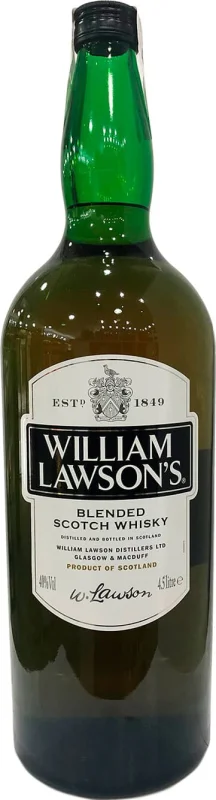 | Marca | WILLIAM LAWSON'S | | Capacidad | 4,5 Litros | | Formato | Cristal | | Zona de Producción | Dundee | | Tipo | Blended | | Barricas | Roble Blanco ex Jerez | | Graduación Alcohólica | 40% |